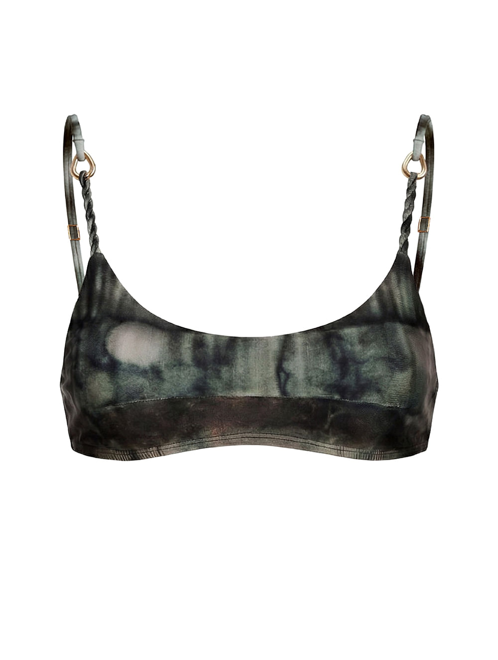 Top faixa estampado. O modelo possui bojo removível, detalhe de costura zig zag, alças trabalhadas