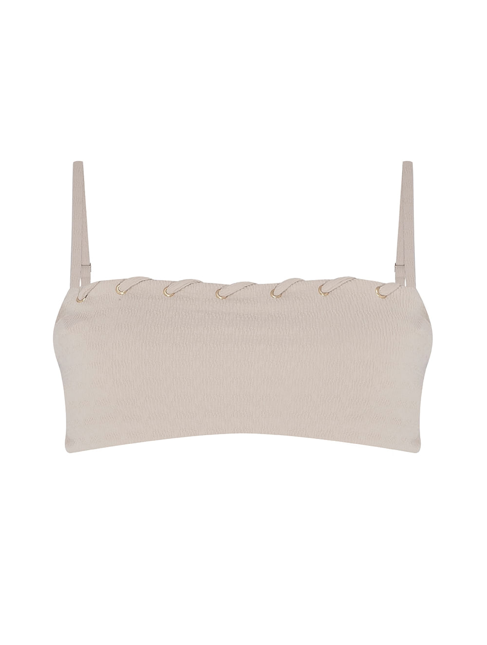 Top faixa liso. O modelo é trabalhado em tecido com textura, possui bojo removível, acabamento de ilhós no decote com detalhe de alinhavo do próprio tecido, alças com regulagem e fecho de imã no banho de Ouro Fosco nas costas.