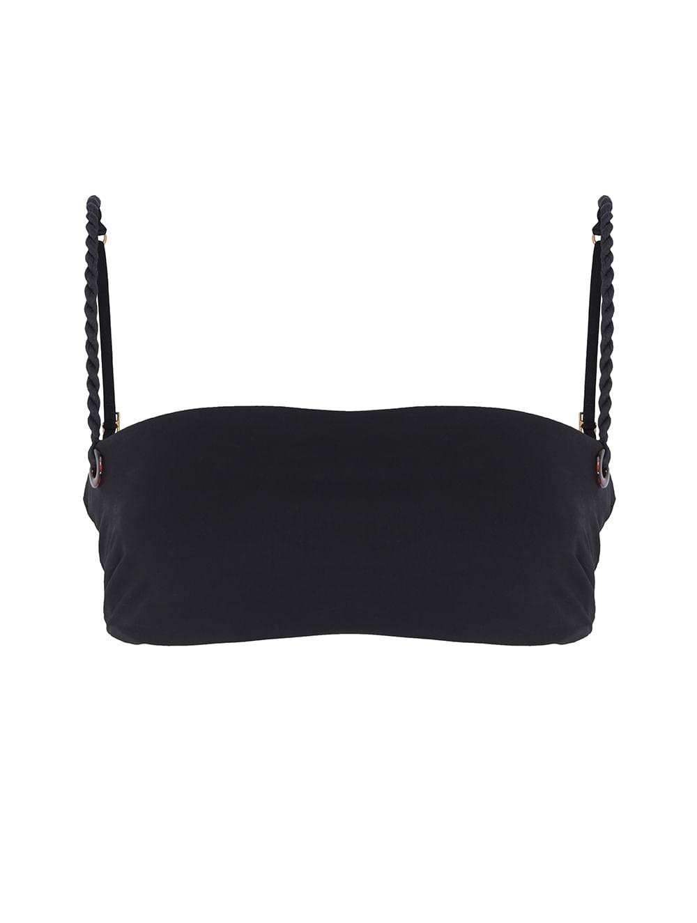 Top faixa liso. O modelo possui bojo removível e alças com regulagem trabalhadas em trançado do próprio tecido com detalhe de ilhós no efeito tartaruga. Não possui fecho nas costas.