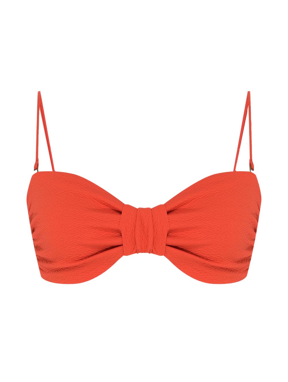 Top faixa liso. O modelo é trabalhado em tecido com textura, possui modelagem de alças removíveis, anel de tecido no centro do busto e fecho de ímã no banho de Ouro Velho nas costas.