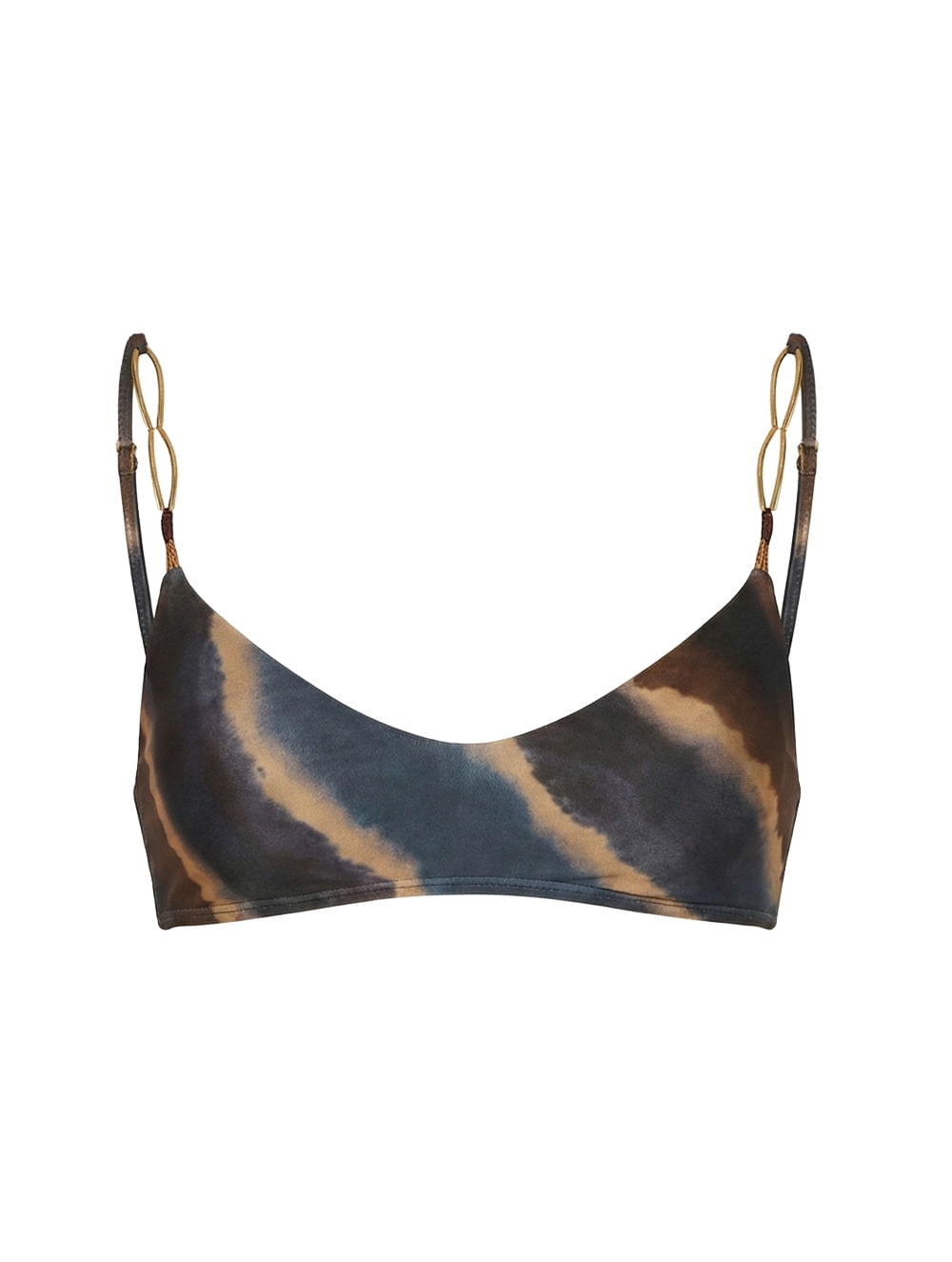 Top faixa estampado. O modelo possui bojo removível, alças finas com regulagem e detalhes de metais no banho Ouro Fosco e costas finas.