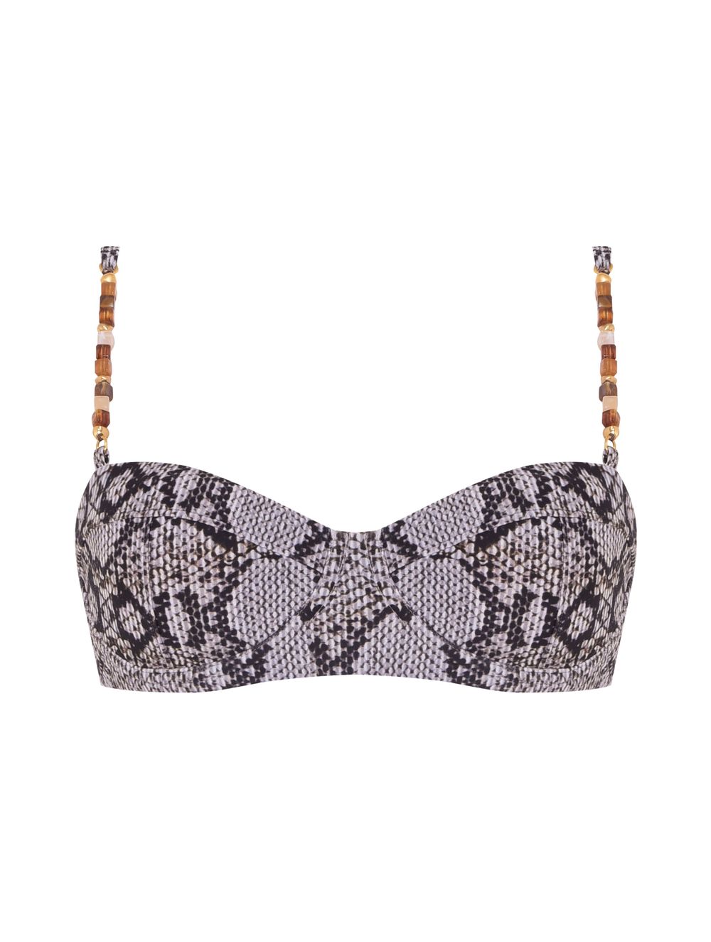 Top meia taça estampado. O modelo possui bojo removível, aro para maior sustentação, alças fixas com regulagem trabalhadas em pedras naturais e detalhes de metal no banho de Ouro Fosco, e fecho de imã nas costas. Um modelo super sofisticado graças às suas alças feitas de pedras naturais e o banho a ouro.