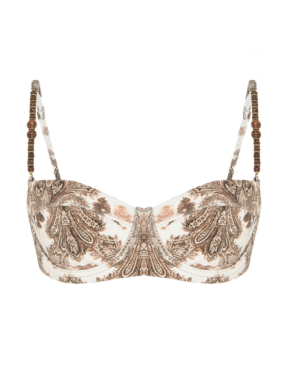 Top meia taça estampado. O modelo possui bojo removível, alças fixas trabalhadas com regulagem, aro para maior sustentação e fecho de ímã nas costas no banho Ouro Velho.