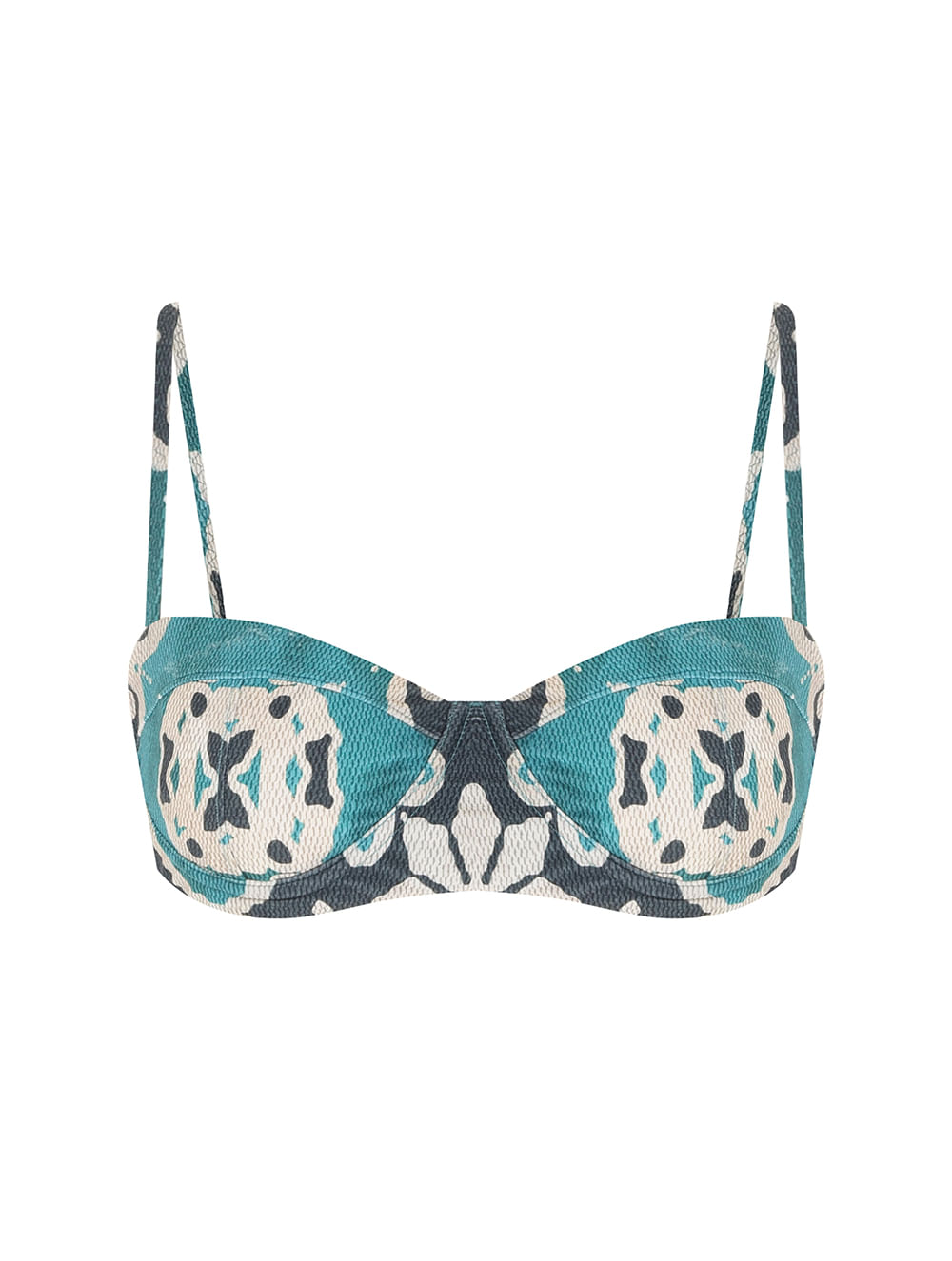 Top meia taça estampado. O modelo é trabalhado em tecido com textura, possui bojo removível, aro para maior sustentação, regulagem nas alças, fecho nas costas e detalhes de metal no banho de Ouro Velho.
