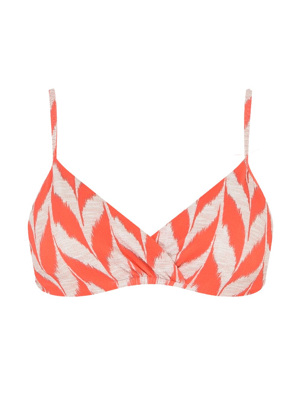 Top meia taça estampado. O modelo possui bojo removível, alças fixas com regulagem, aro para maior sustentação e detalhe transpassado na frente com leve franzido. Peça com amarração nas costas e aviamentos no banho Ouro Fosco.