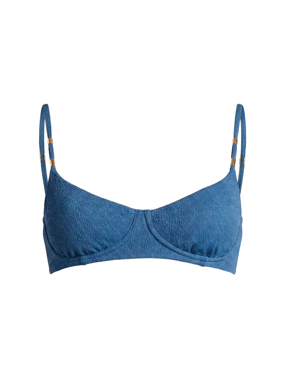 Top meia taça liso. O modelo é trabalhado em tecido com textura, possui bojo removível, aro para maior sustentação, alças com regulagem trabalhadas com detalhe de metal tubinho no banho de Ouro Fosco e amarração nas costas.