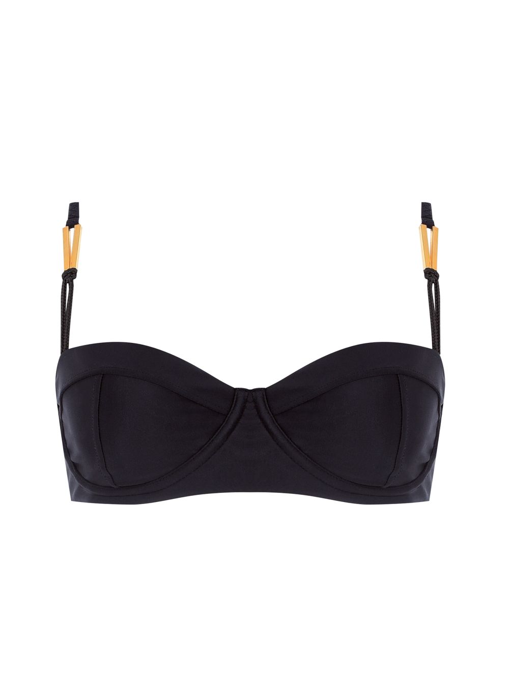 Top meia taça liso. O modelo possui bojo removível, aro para maior sustentação, alças fixas trabalhadas com regulagem, elástico e detalhe de metal no banho de Ouro Fosco e fecho de imã