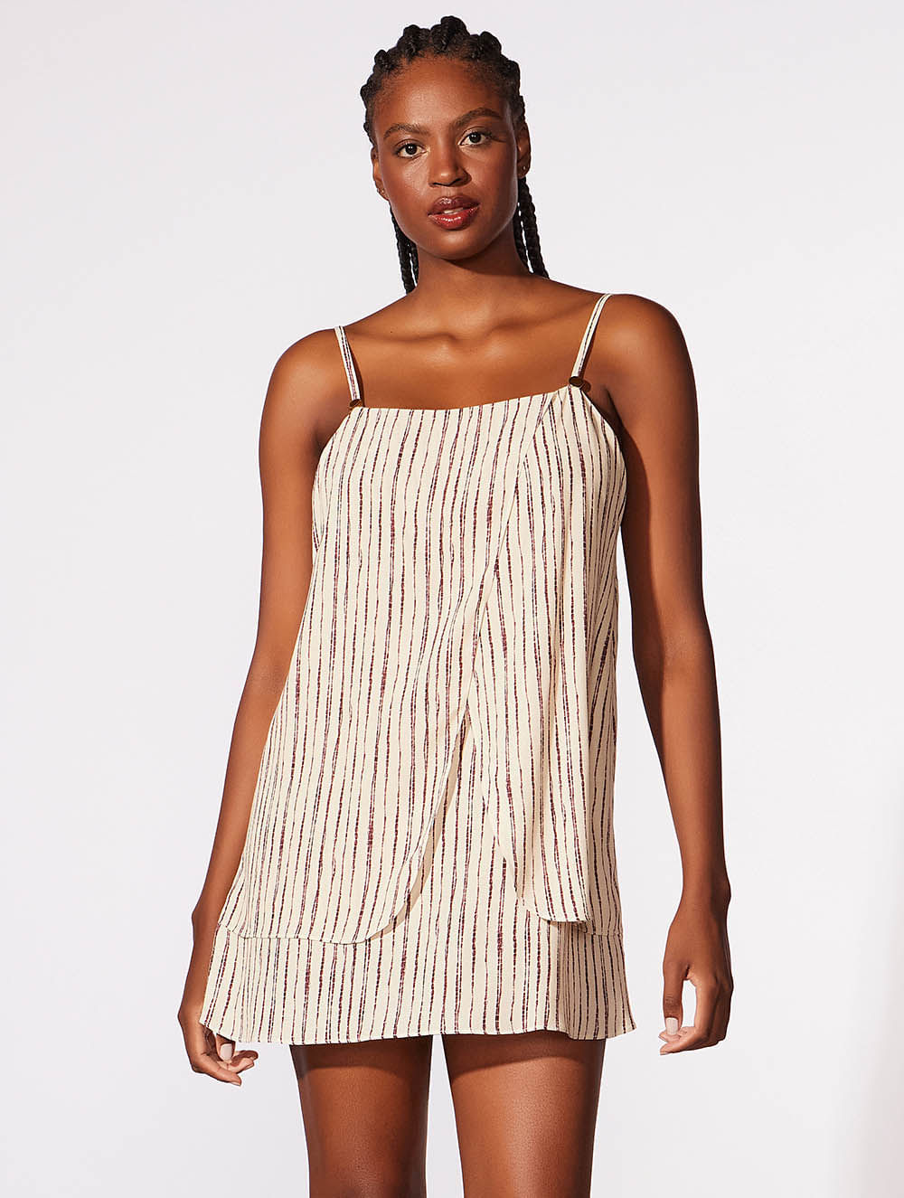 Vestido curto estampado. O modelo possui caimento fluido, detalhe de camadas com transpasse e alças ajustáveis trabalhadas com detalhe de resina marrom envolta em metal com banho em Ouro Light.