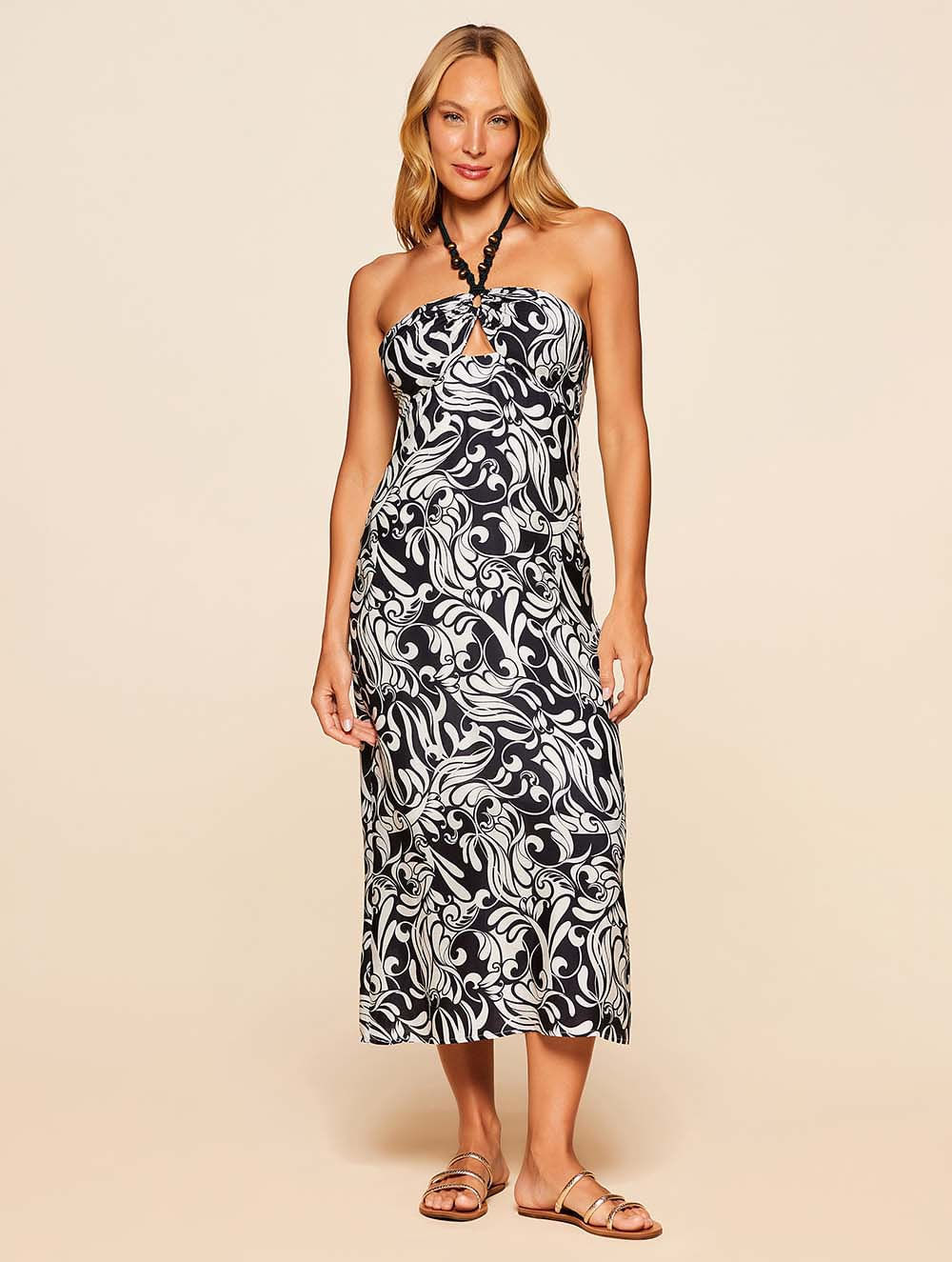 Vestido midi estampado. O modelo possui recorte no centro do busto, decote frente única com alças em cordão trabalhado para amarração no pescoço e amarração nas costas.
