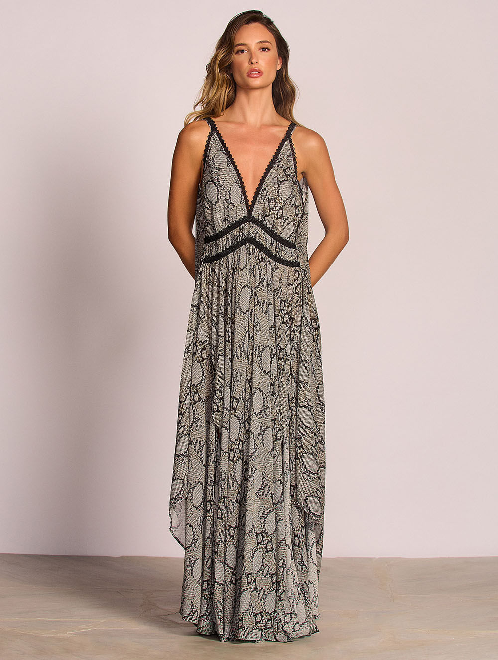 Vestido longo estampado. O modelo possui caimento esvoaçante com leveza e movimento, decote em V deepneck frente e costas, detalhe de acabamento em renda, amarração nas costas para regulagem permitindo um shape mais justo e fenda frontal.