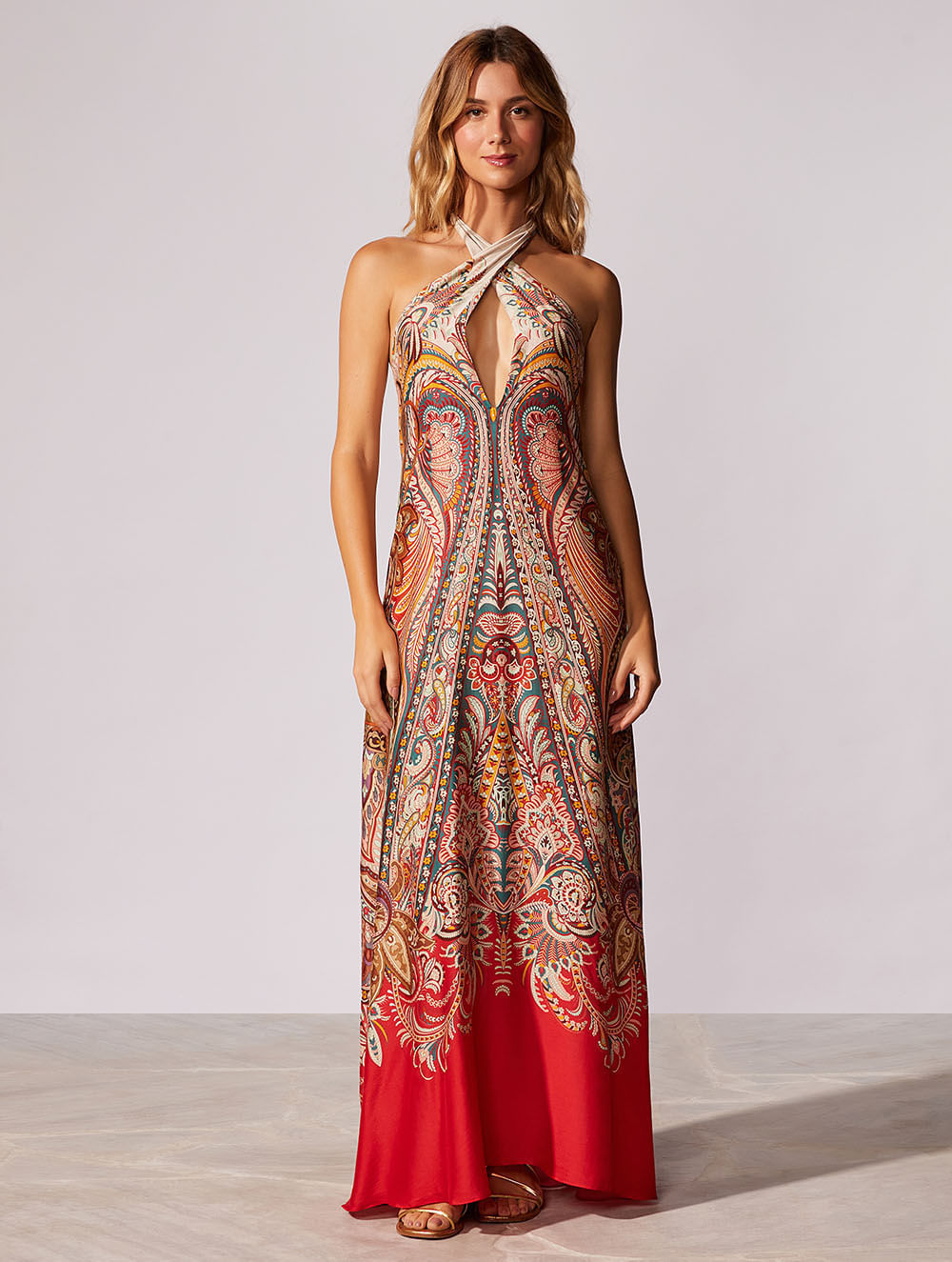 Vestido longo com estampa localizada. O modelo possui decote frente única com amarração no pescoço e elástico no decote das costas para maior segurança.