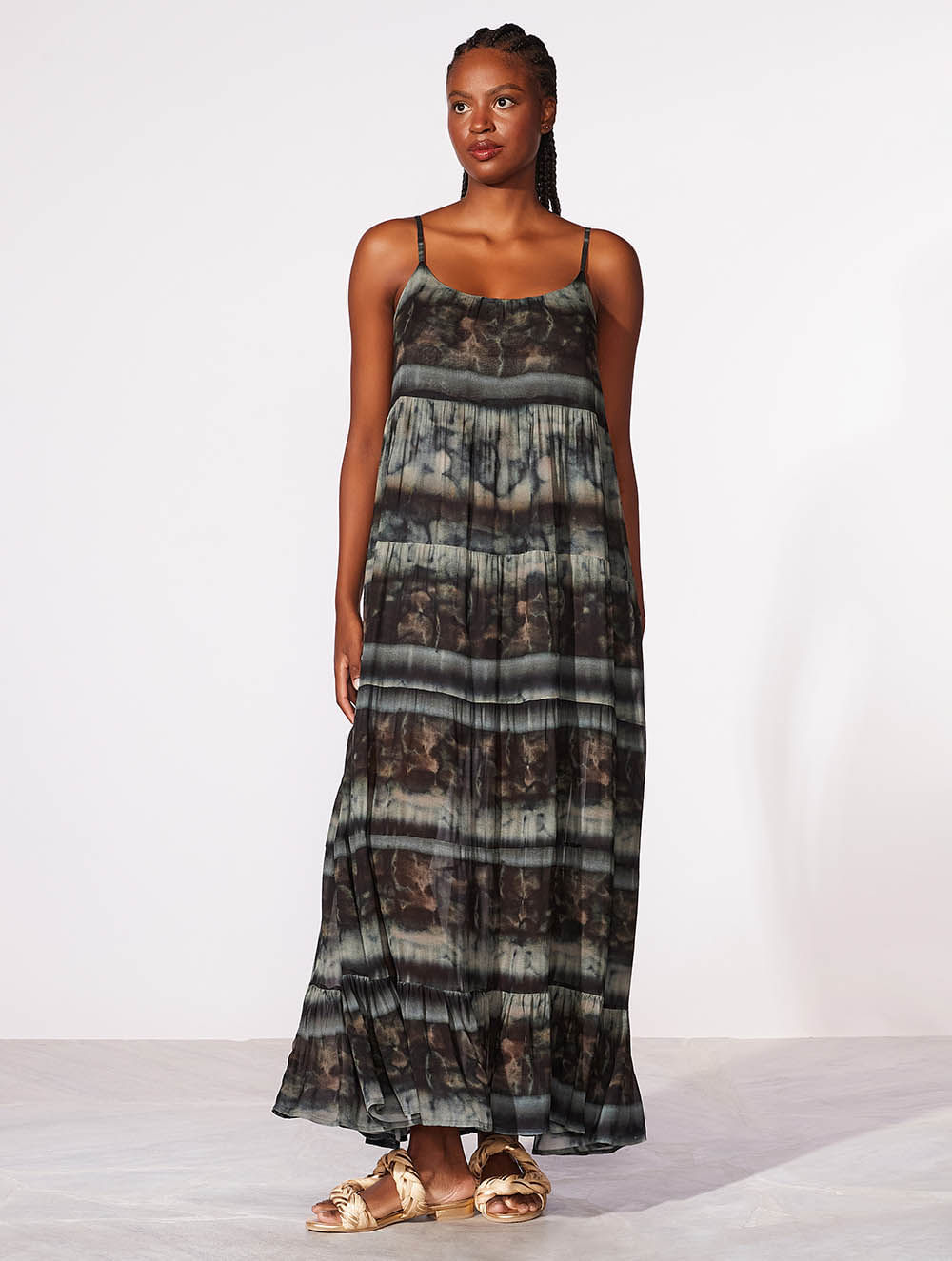 Vestido longo estampado. O modelo possui alças finas com regulagem, babados e forro de tule estampado.