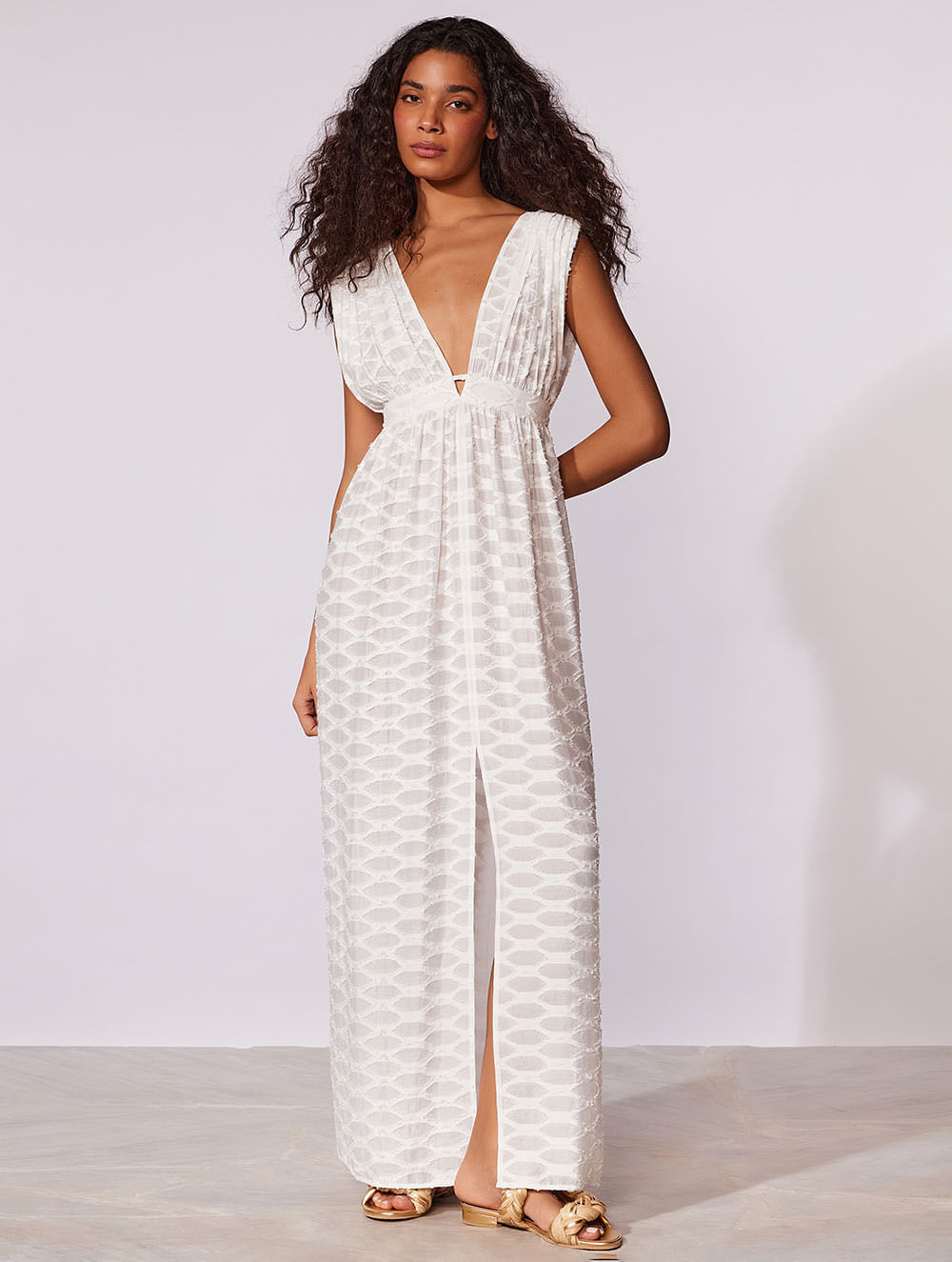 Vestido longo liso. O modelo é trabalhado em tecido jacquard com textura, possui caimento esvoaçante, decote em V deepneck frente e costas, amarração nas costas para regulagem permitindo um shape mais justo, e fendas frontais e laterais.