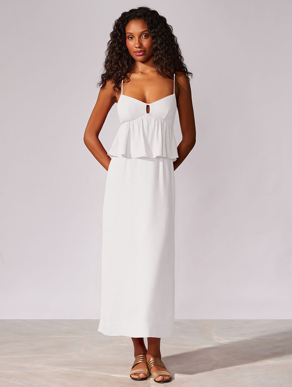 Vestido midi liso. O modelo possui recorte central cut out, babado abaixo do busto, alças reguláveis e zíper invisível com lastex nas costas.