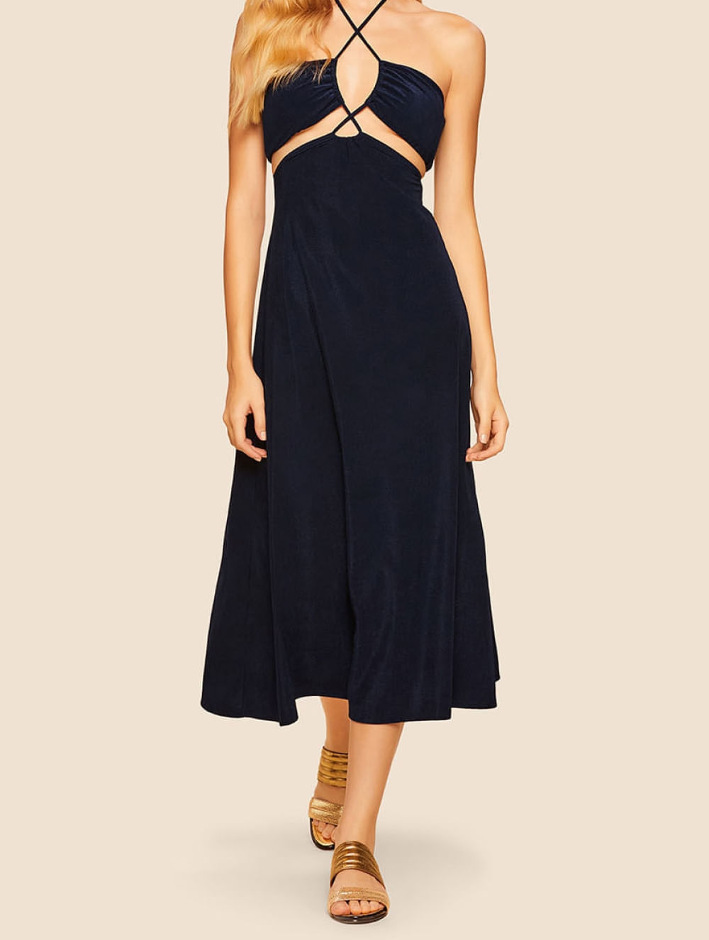 Vestido liso em comprimento Midi. O modelo possui modelagem cut out com recortes frontais com busto ajustável, alças finas cruzadas, bojo removível, fecho de imã em Banho de Ouro nas costas e saia com forro.