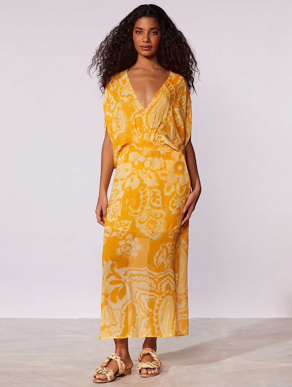 Vestido midi estampado. O modelo possui decote em V, mangas amplas, faixa na cintura com amarração nas costas, fendas laterais e forro de tule na mesma estampa.