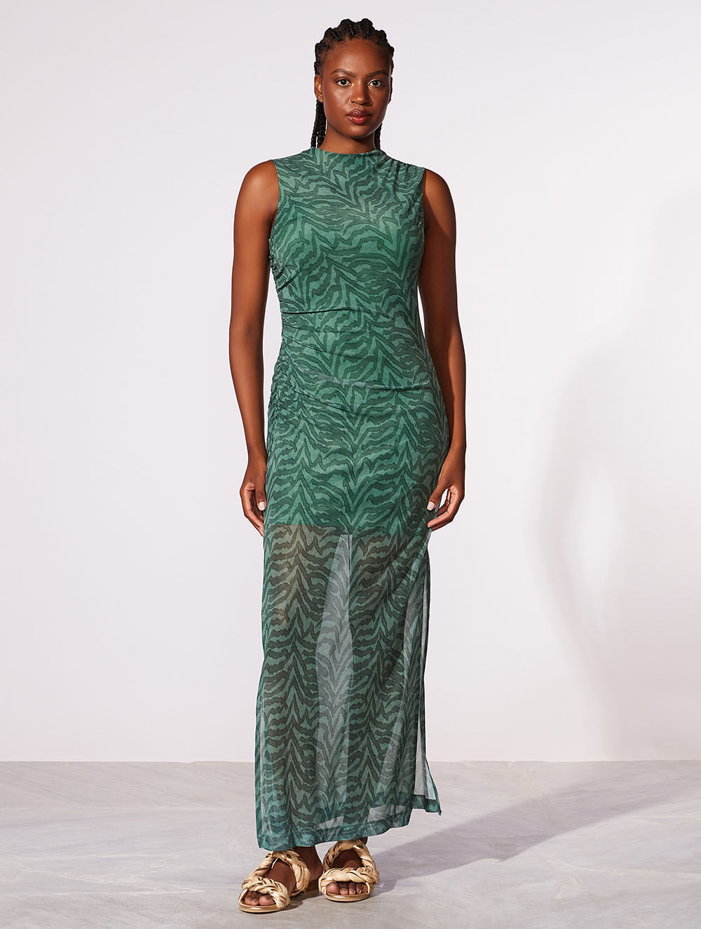 Vestido midi estampado. O modelo possui e tule com forro de malha. Gola alta e detalhe de franzido.