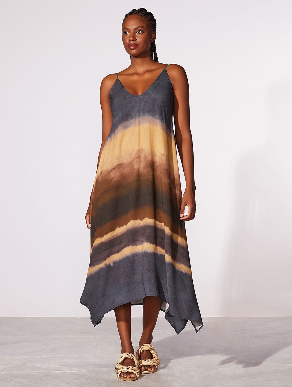 Vestido midi estampado. O modelo possui estampa localizada, shape amplo, decote em V, alças com regulagem e modelagem assimétrica.