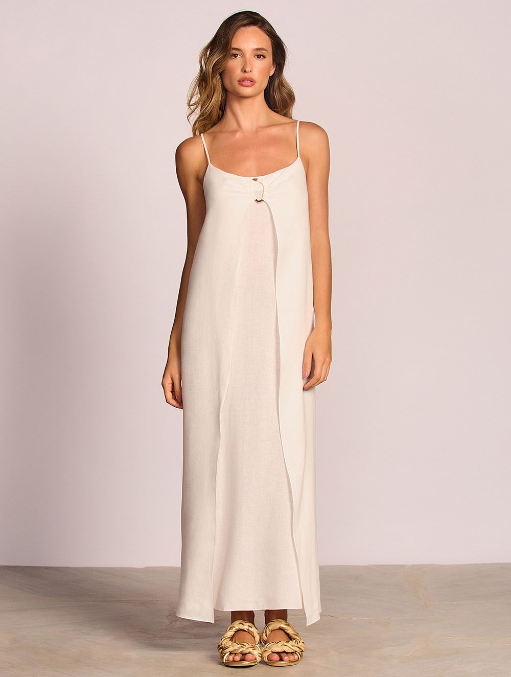 Vestido midi liso. O modelo possui modelagem solta ao corpo, detalhe de aviamento de metal no centro do busto, sobreposição de tecido, lastex nas costas e alças com regulagem.