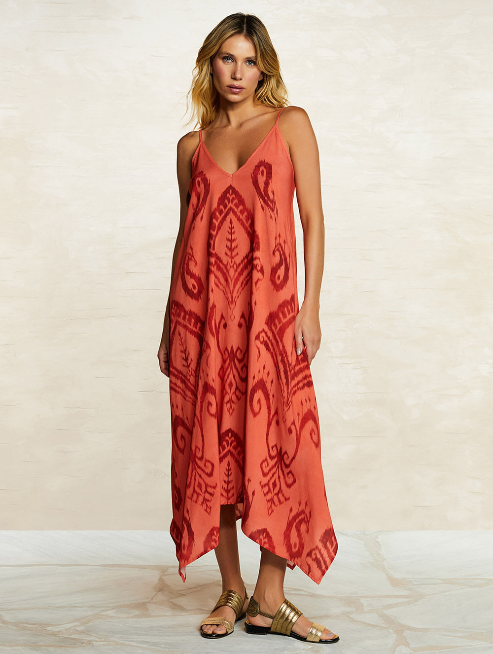 Vestido midi estampado, modelo com alças finas reguláveis e barra assimétrica.